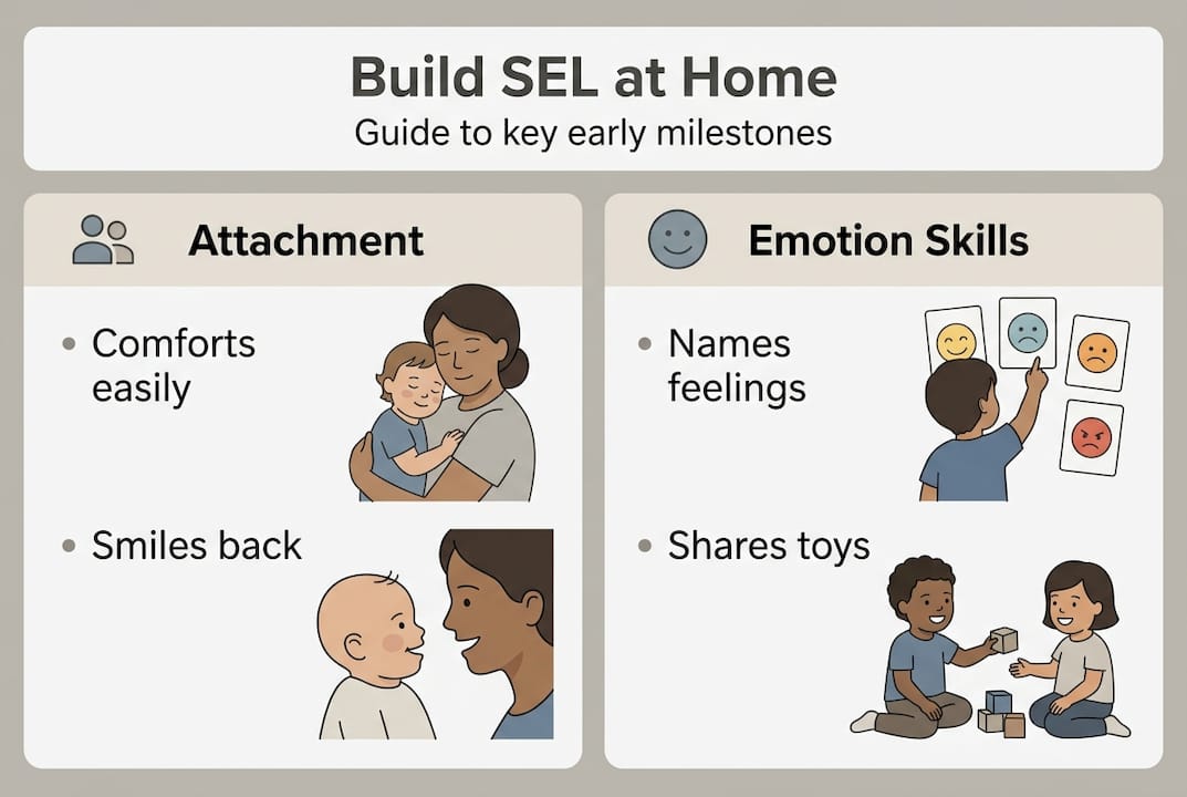 Every parent has been there: your toddler melts down at the grocery store, your infant won't stop crying despite everything you've tried, or your preschooler refuses to share with a friend. These moments feel overwhelming, but they are also opportunities. Social-emotional learning (SEL) is the process through which children learn to understand their feelings, build relationships, and make thoughtful choices. Research consistently shows that the emotional foundation you build at home in the first five years shapes how your child will connect with others, handle stress, and learn for the rest of their life. This guide gives you practical, science-backed strategies to support that growth every single day.